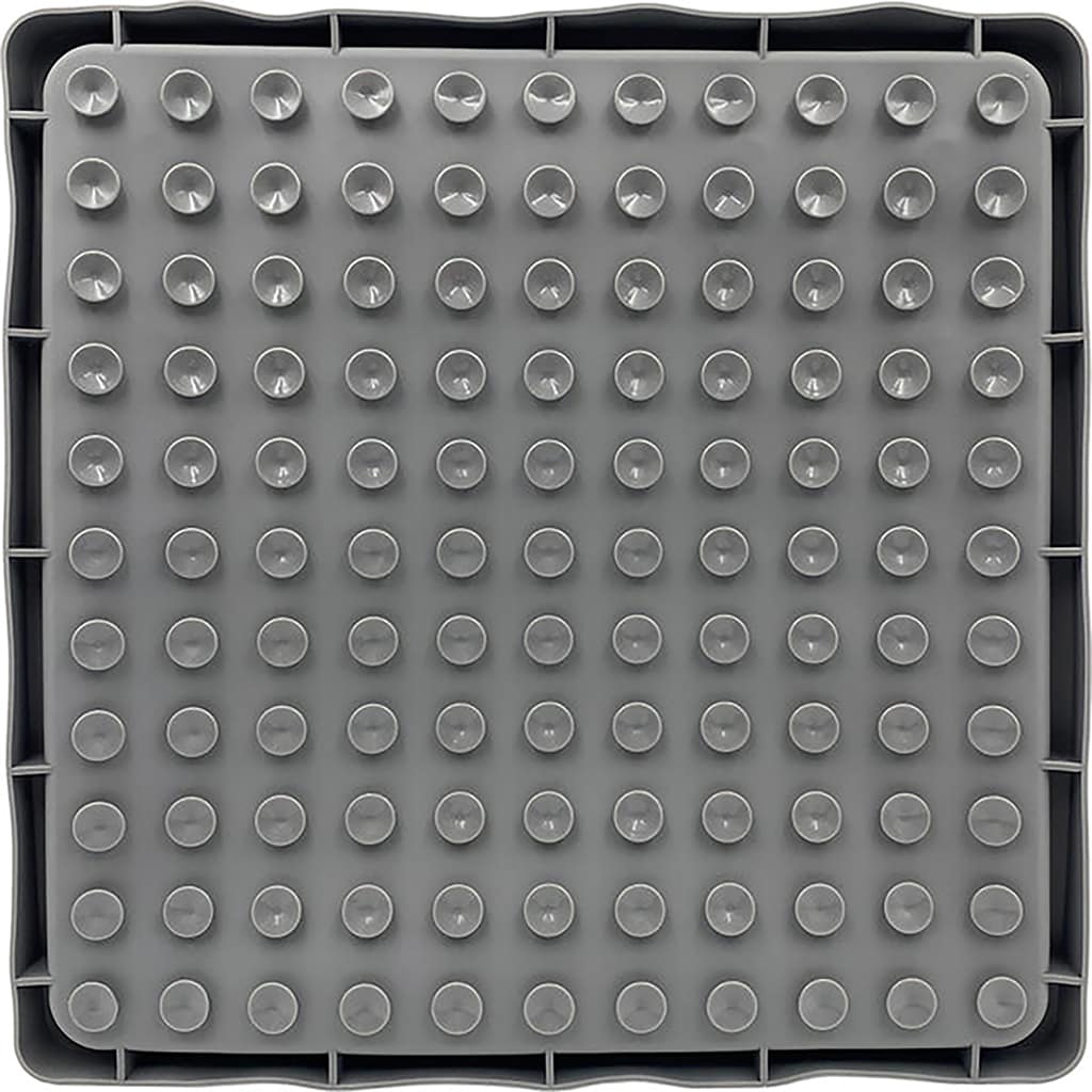 Suction pad on reverse of mat enables it to be secured to a smooth surface, to prevent movement.