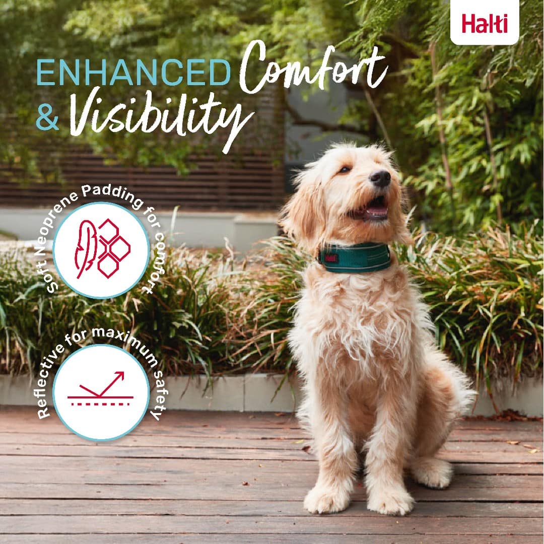 Safety is built into every detail. The collar features 360-degree reflective stitching for improved visibility during early-morning or evening walks, helping keep your dog seen in low light or poor weather. The thoughtful design extends to style as well, with timeless colours and matching Halti leads and harnesses available, making it easy to create a coordinated walking set.
