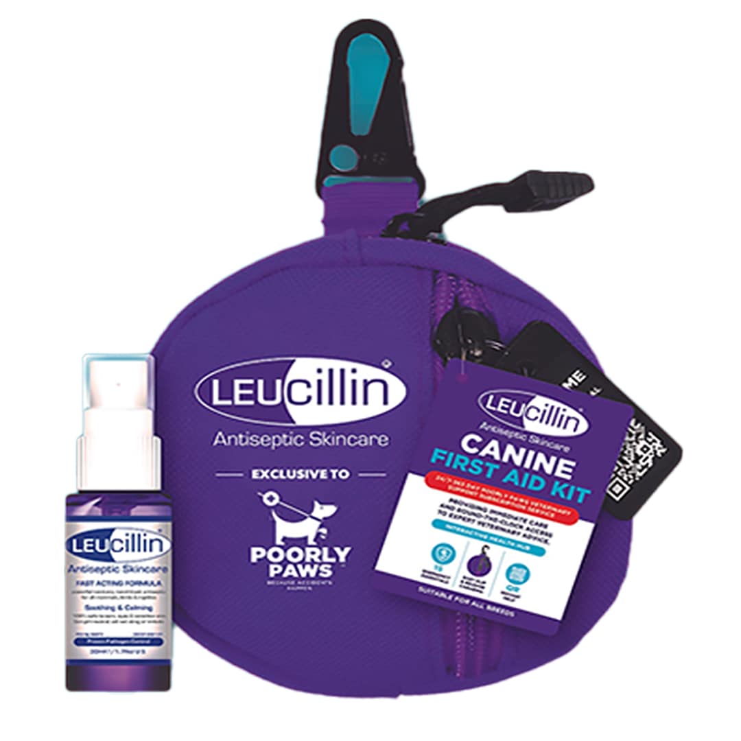 Leucillin, the most powerful, non-toxic, non-irritant antiseptic available and Poorly Paws compact, convenient and lightweight First Aid Kit together in 1 handy kit.