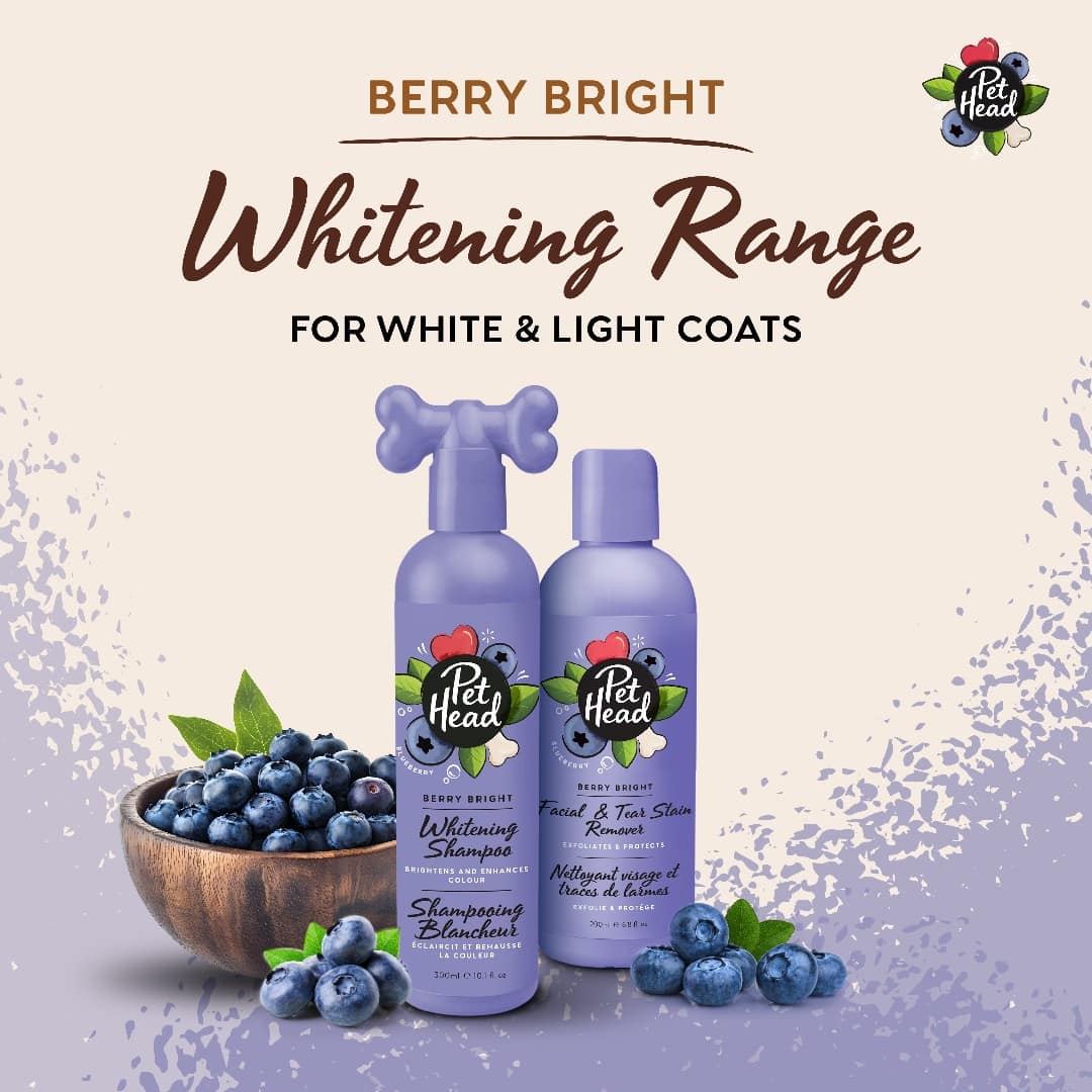 The Pet Head Berry Bright range is specially developed to brighten white and light-coloured coats while keeping skin and hair healthy. Designed by pet professionals, these formulas gently cleanse, enhance coat colour and restore shine without harsh bleaching agents.