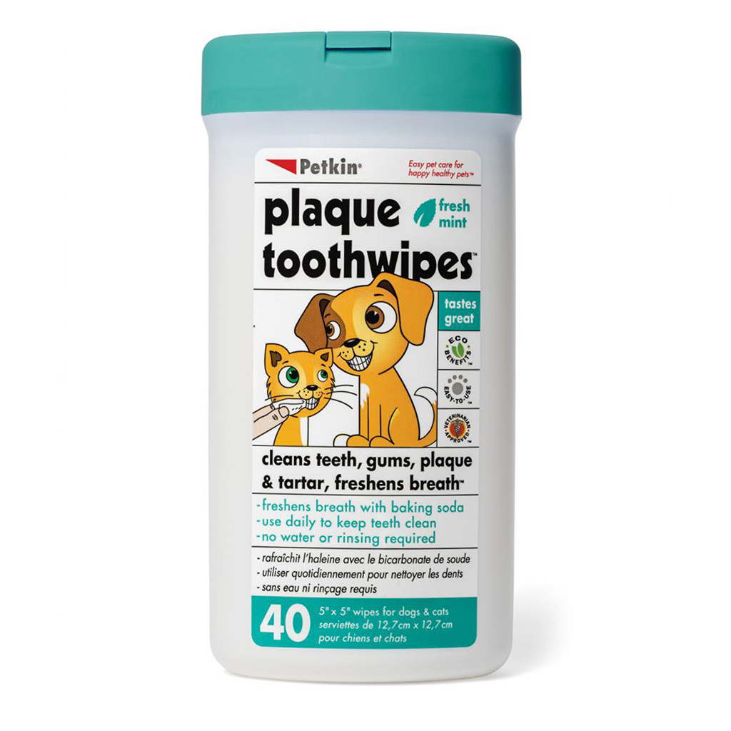 Using Petkin ToothWipes is as simple as it gets. Each pack contains 40 wipes, each measuring 5″ x 5″. To use, pull a wipe up and tear it at a slight angle. Wrap the wipe around your index finger, open your pet’s mouth, and gently rub several teeth at a time until they are clean. Be patient, as some pets may resist cleaning at first. Use additional wipes as necessary, and remember that no water or rinsing is required. Always exercise caution when working in or around your pet’s mouth to avoid any unintended biting. Please note that these wipes are not for child use.