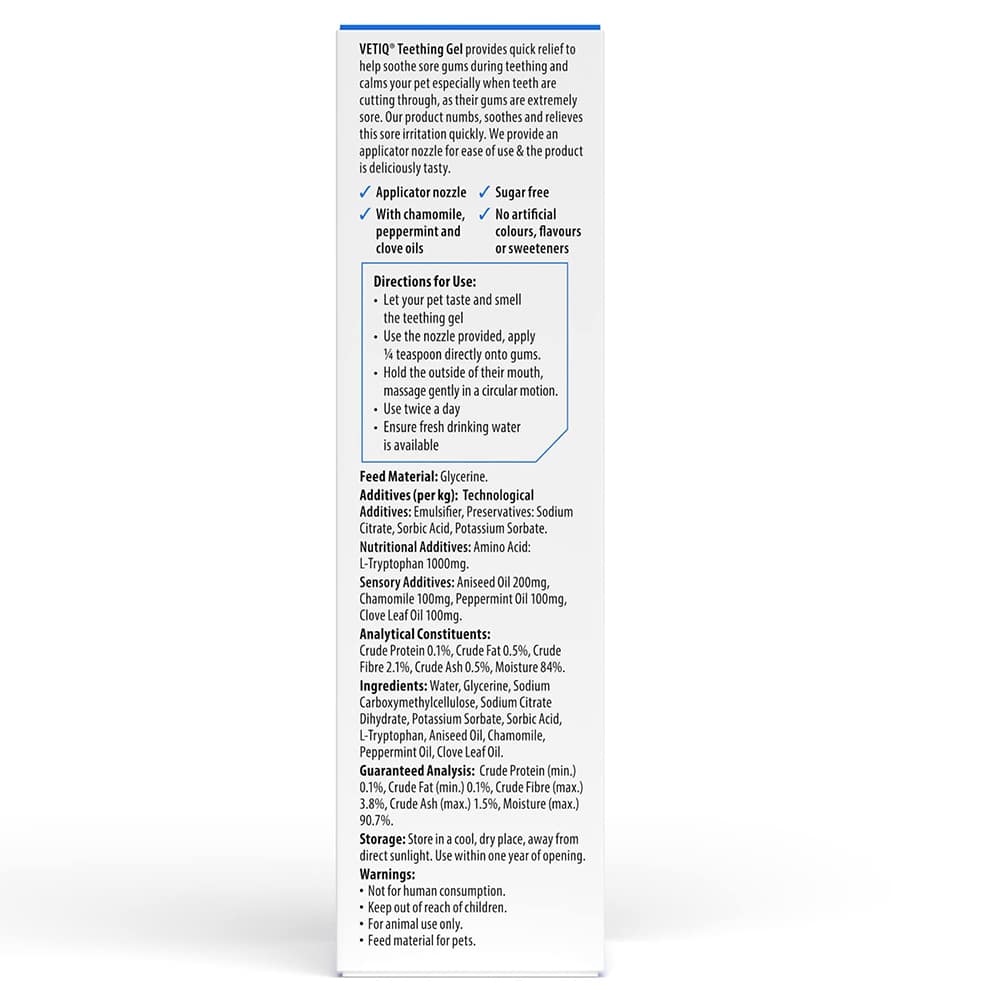 Teething is a necessary part of your puppy’s development, but it doesn’t have to be a painful one. VetIQ Teething Gel is your ally in helping your puppy through this challenging phase. Soothe those sore gums and reduce unwanted chewing with this essential teething companion. Your puppy will thank you for it!