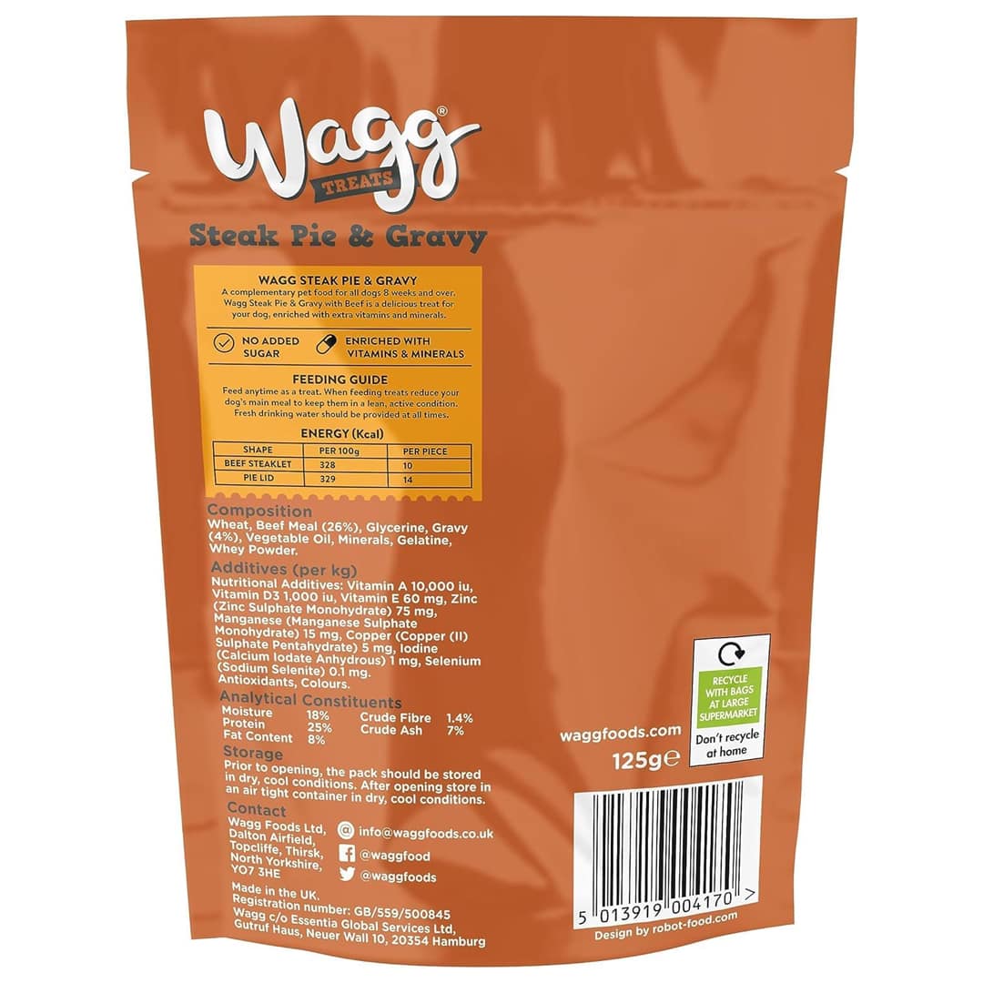 Wagg Steak Pie & Gravy Tasty Bites with Beef are a delicious treat for your dog, oven baked and enriched with extra vitamins and minerals, with no added sugar