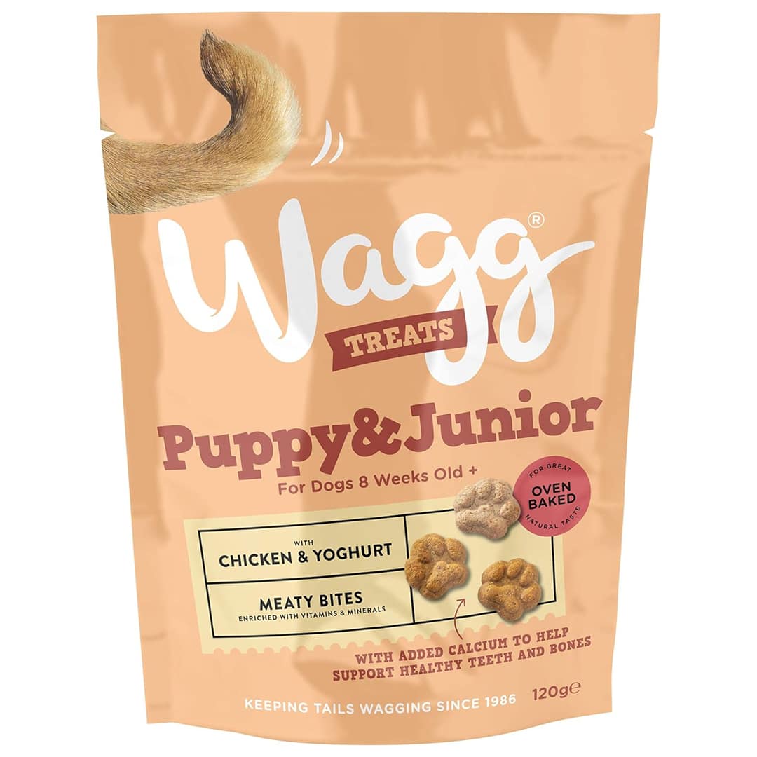 Wagg Puppy & Junior – Tasty Meaty Bites with Chicken & Yoghurt are a delicious treat for your dog, oven baked, and enriched with extra vitamins and minerals, with no added sugar